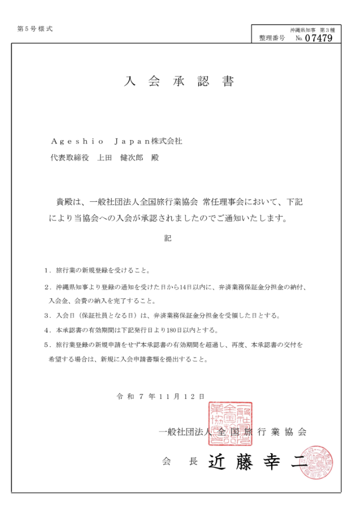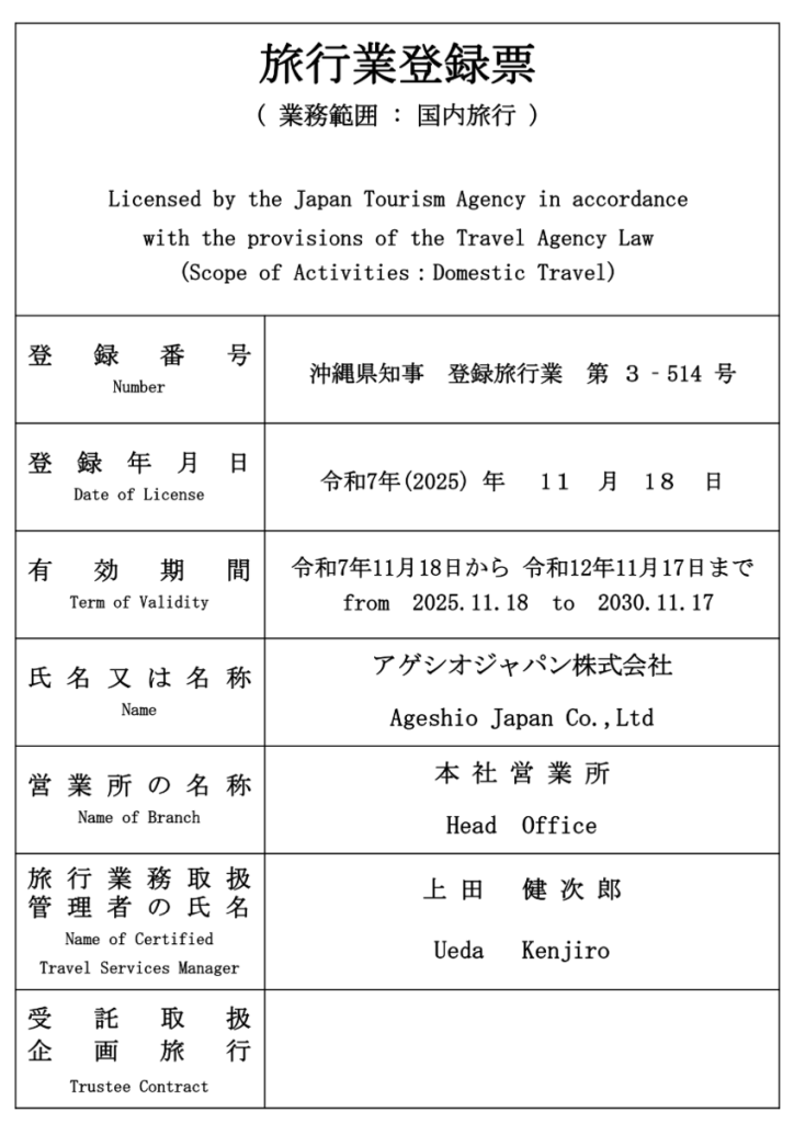 Okinawa Prefectural Governor Registered Travel Agency No.3-514